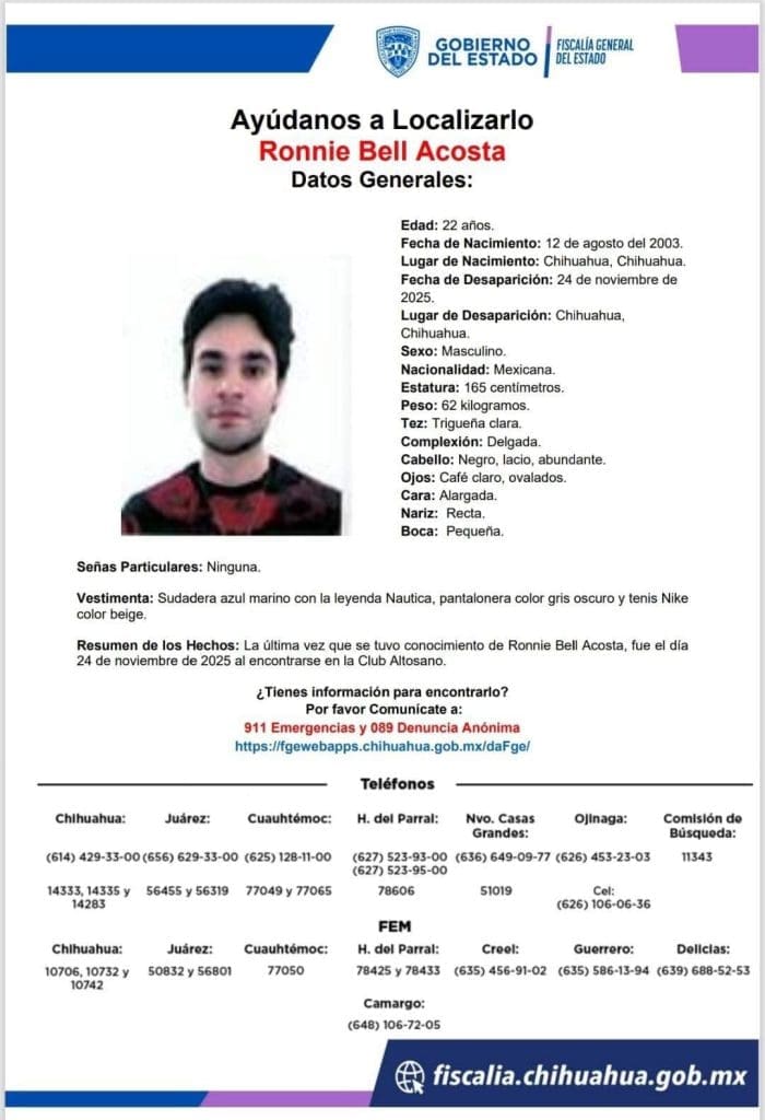 La Fiscalía General del Estado emitió una pesquisa urgente para localizar a Ronnie Bell Acosta, joven de 22 años desaparecido el 24 de noviembre de 2025 en la ciudad de Chihuahua.