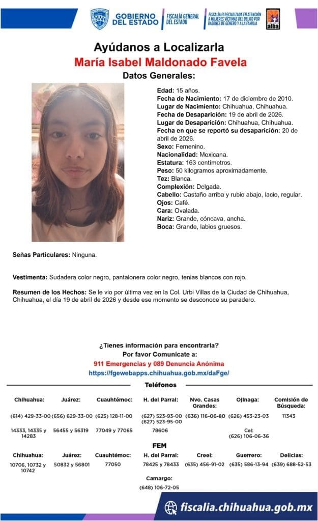 Autoridades estatales activaron una pesquisa para localizar a María Isabel Maldonado Favela, una adolescente de 15 años de edad, reportada como desaparecida en la ciudad de Chihuahua.