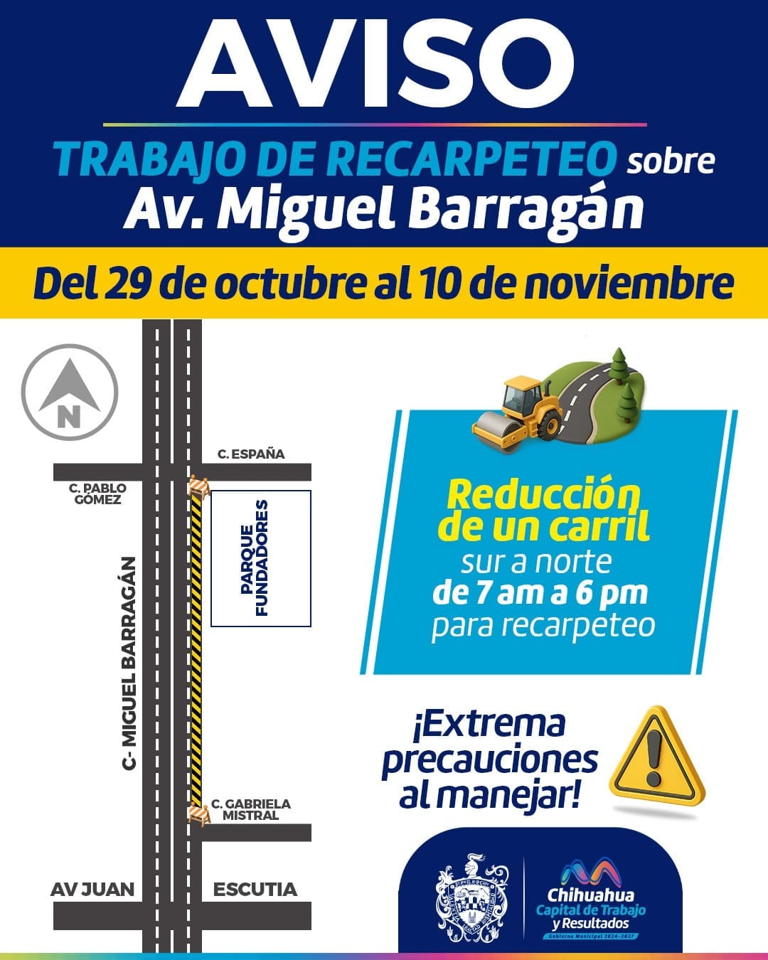 El Gobierno Municipal, a través del Consejo de Urbanización Municipal (CUM), informó que a partir de este miércoles 29 de octubre se llevarán a cabo trabajos de recarpeteo en la avenida Miguel Barragán, en el tramo que comprende de la calle Gabriela Mistral a la calle España, en sentido de sur a norte.