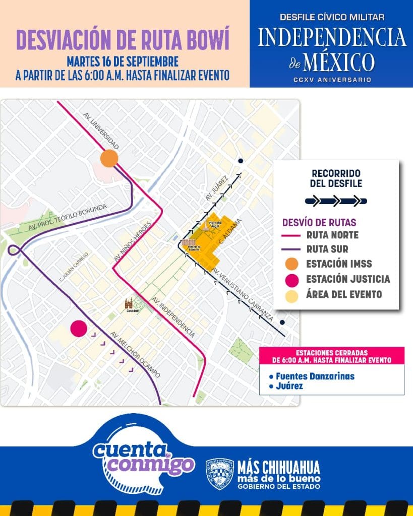 La Operadora de Transporte a cargo del Bowi dio a conocer que la ruta troncal sufrirá algunos desvíos, debido al desfile conmemorativo por el inicio del Movimiento de Independencia de México.