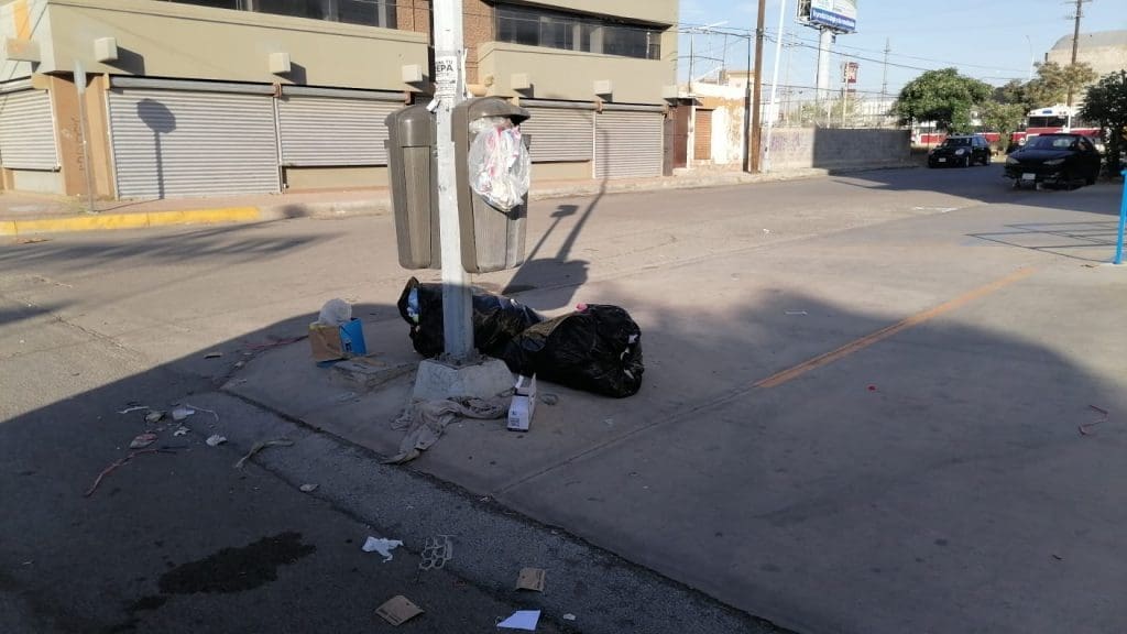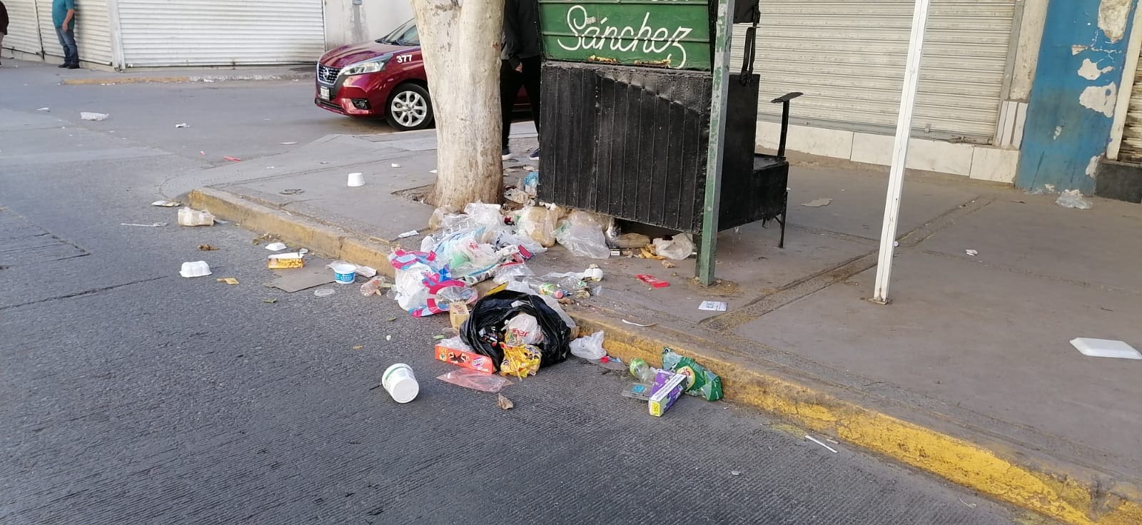 En un recorrido por el primer cuadro de la ciudad, se detectó una importante acumulación de basura en la intersección de la avenida Niños Héroes y calle Quinta, donde comerciantes han dejado bolsas de desechos que terminan dispersas, incluso por la presencia de animales callejeros.