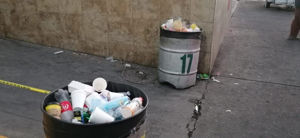 A las afueras del Hospital, los botes de basura se encontraban totalmente rebasados, con desechos acumulados en el piso y un evidente foco de insalubridad justo a las afueras de Urgencias donde decenas de derechohabientes permanecen en espera.