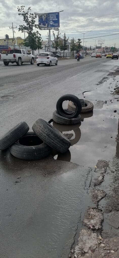 Vecinos de ponen llantas en baches de la Avenida Tecnologico y Privada de Cedro, ante la profundida de los baches que se formaron tras las lluvias que se han presentado en la ciudad.