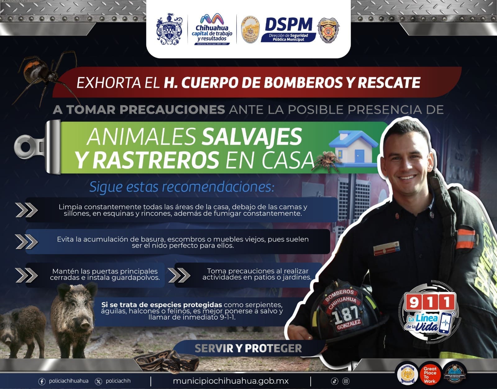 El Heroico Cuerpo de Bomberos y Rescate del Municipio, pide a la comunidad tener precauciones con la aparición de animales silvestres, rastreros y/o ponzoñosos que suelen llegar a los hogares en busca de agua o refugio. Por la llegada de las altas temperaturas.