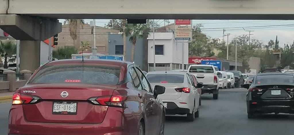 El problema afecta principalmente a quienes transitan por la avenida Pacheco hacia el sur, así como a quienes toman la lateral de Teófilo Borunda en dirección a avenida de las Industrias. La situación se agrava durante las horas pico, generando largas filas y desesperación entre los conductores.