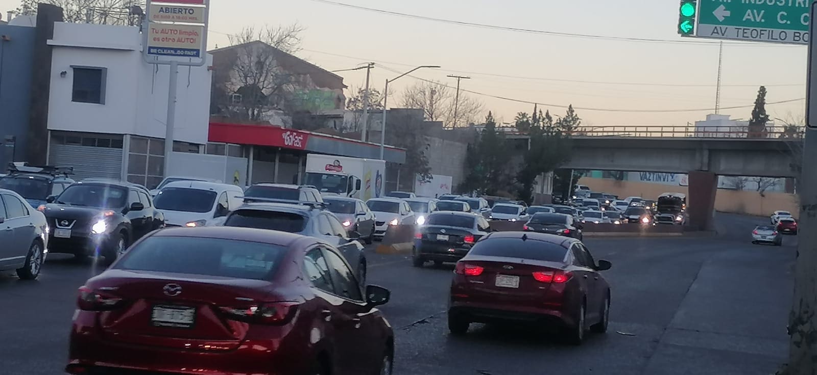 La mañana de este miércoles se registra un fuerte congestionamiento vehicular en la intersección de la avenida de las Industrias y boulevar Teófilo Borunda, uno de los cruces más transitados de la capital.