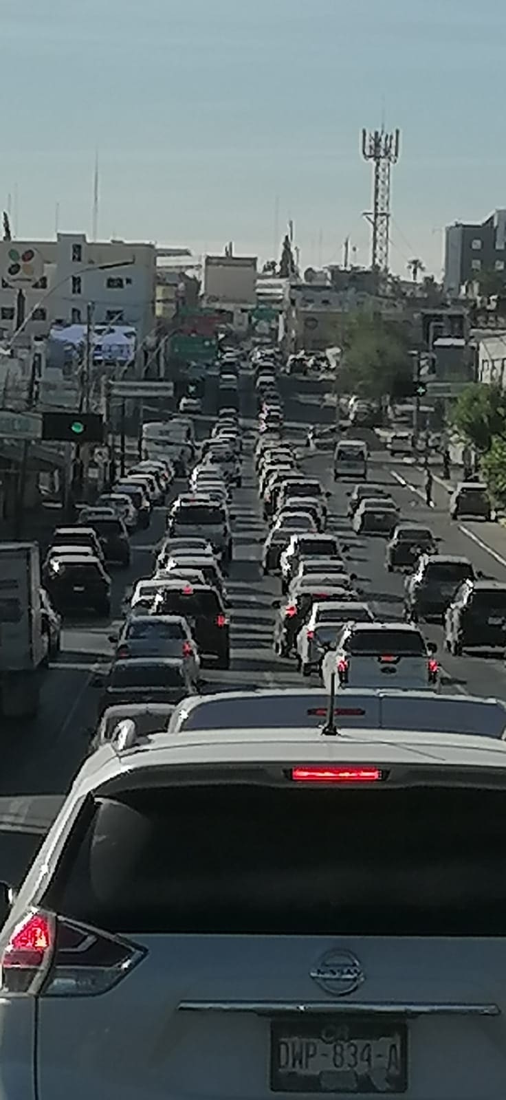 Información de la Unidad Móvil de Noticieros Radiorama señala que las filas de vehículos se extienden desde el puente de Teófilo Borunda hasta la calle Progreso, con avance lento principalmente en el carril derecho para quienes buscan ingresar al estacionamiento ubicado en la zona de la calle 14 y Juárez.