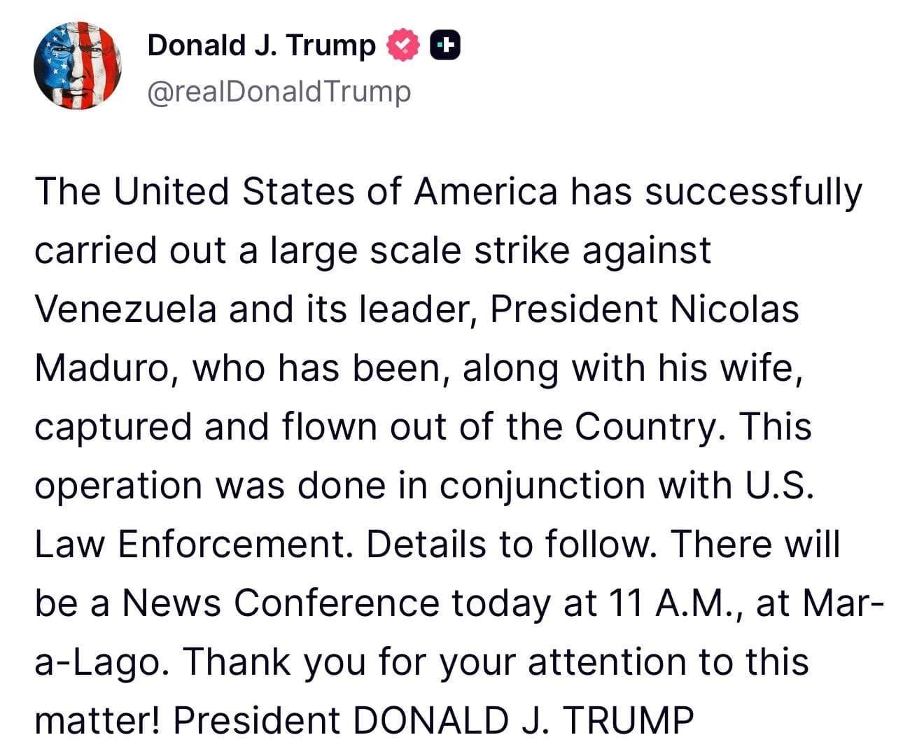 Una publicación atribuida al expresidente Donald J. Trump afirma que Estados Unidos habría ejecutado un ataque a gran escala contra Venezuela, que habría derivado —según el propio mensaje— en la captura del presidente venezolano Nicolás Maduro y de su esposa, quienes presuntamente fueron sacados del país por vía aérea.
