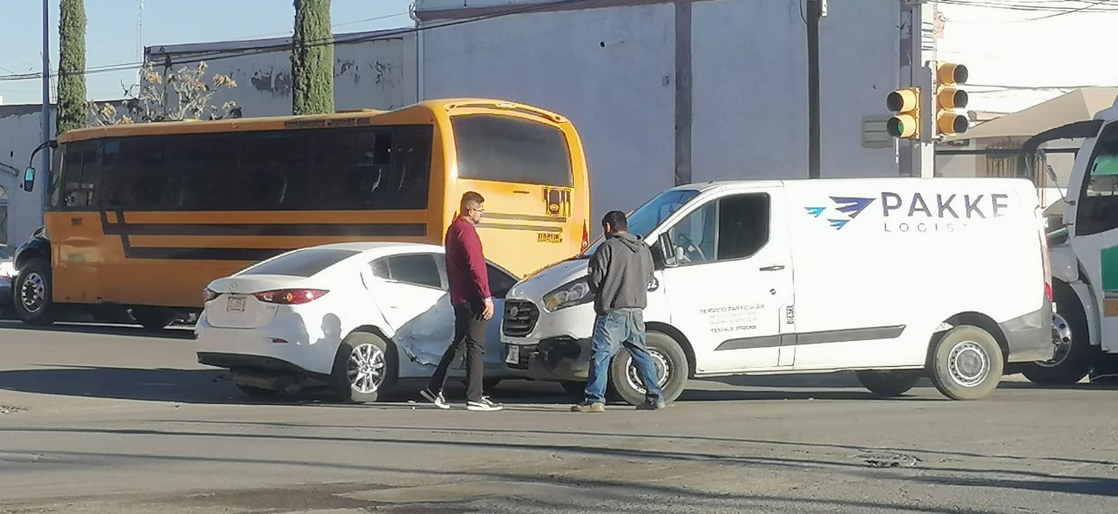 La Unidad Movil de Noticieros Radiorama reportó esta mañana un fuerte choque en el cruce de la calle 12 y 20 de Noviembre, donde participaron una camioneta de paquetería y un automóvil particular blanco.