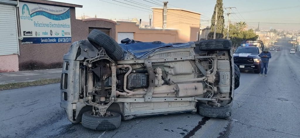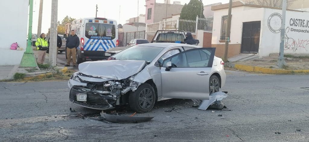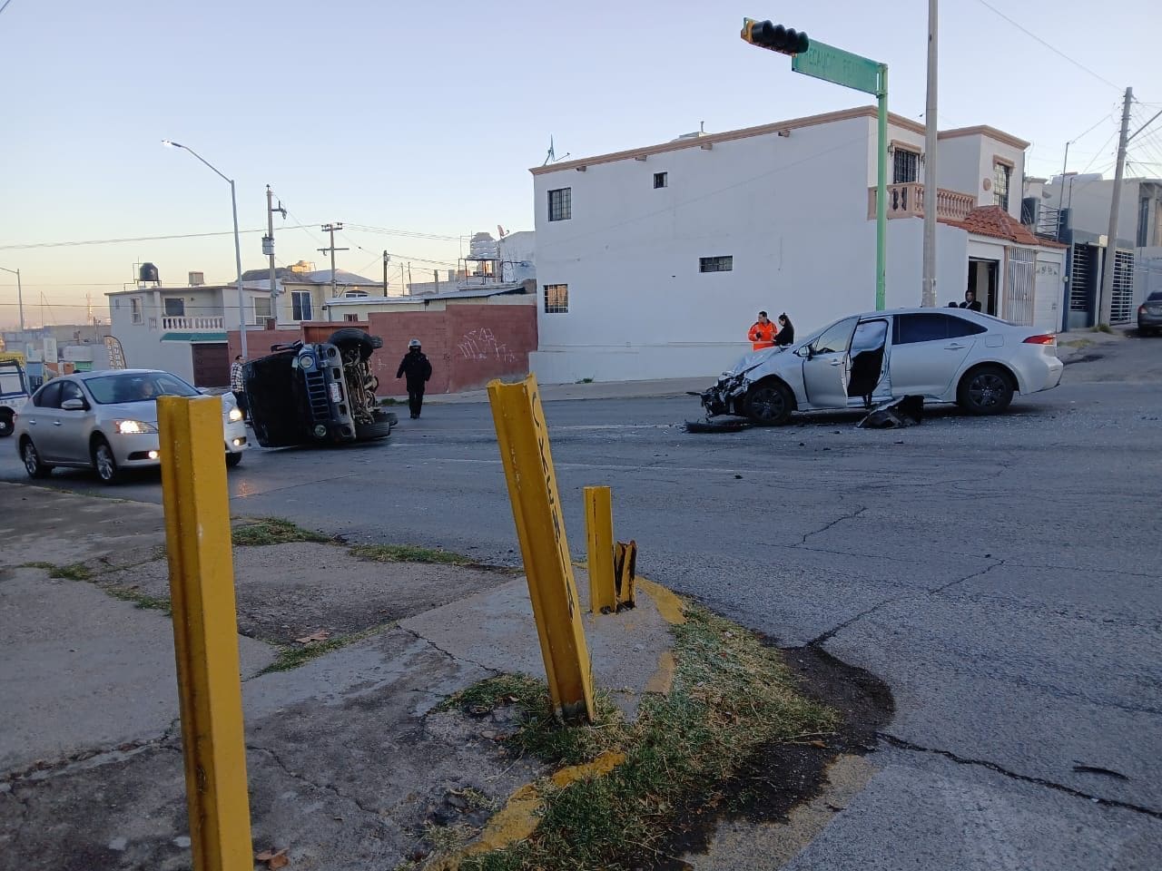 Un fuerte accidente vial se registró la mañana de este miércoles en el cruce de las calles José María Iglesias y Kenia, donde un automóvil Toyota Corolla y una camioneta Jeep Liberty se impactaron, provocando que esta última volcara sobre uno de sus costados.
