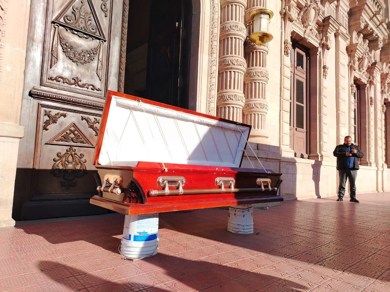 Los inconformes colocaron un ataúd justo frente a la puerta del recinto. Rocío Martínez, una de las representantes, señaló que esta acción simboliza que «el diálogo está muerto», pues asegura que no han sido atendidas sus peticiones y que solo han recibido burlas por parte de la Secretaría General de Gobierno.