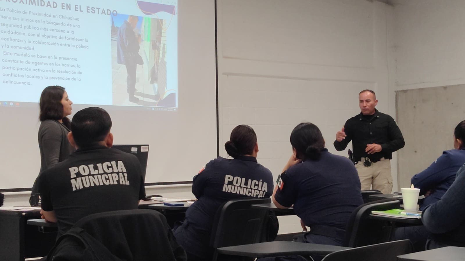 Agentes de la Subdirección Táctica de la Dirección de Seguridad Pública Municipal (DSPM), compartieron sus conocimientos y experiencia sobre la aplicación del modelo de Policía de Proximidad, el cual se implementa en la ciudad de Chihuahua con resultados positivos a policías del municipio de Aquiles Serdán.