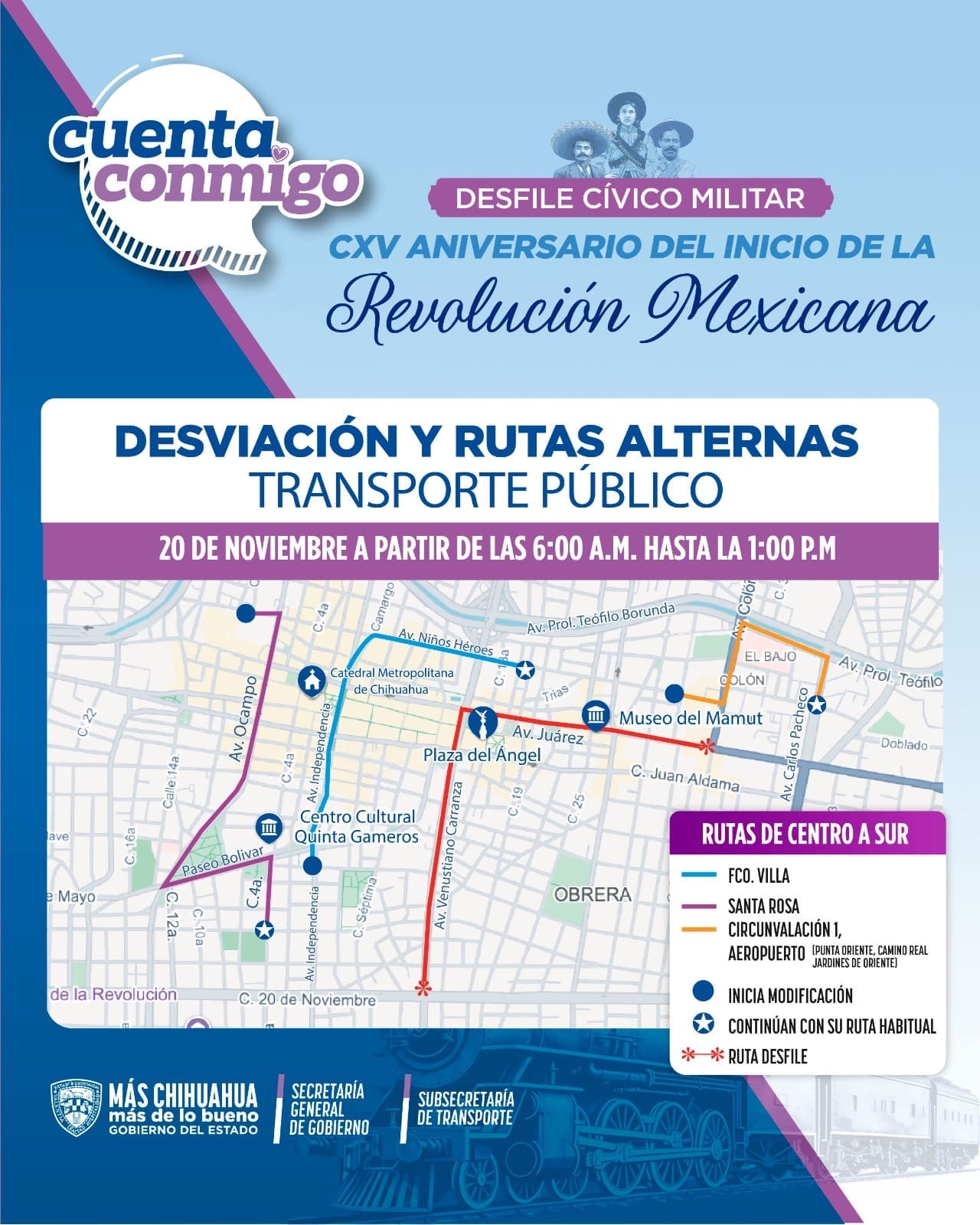 Debido al tradicional desfile del 20 de noviembre, las autoridades cerrarán calles y avenidas principales en el Centro Histórico de la ciudad, por lo que algunas rutas alimentadoras modificarán su trayectoria, como Auxiliar Pistolas Meneses, Ruta 3-Granja, y Mármol.