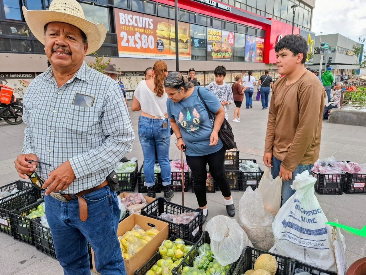 Indica que seguirán en pie de lucha en ese punto, entre las calles Libertad e Independencia en la capital, con un montón de rejas para vender barato directo desde el productor hasta el consumidor, ya que el y su familia le ayudan a exhibir como: cebolla, chile chilaca, jalapeño, plátano, frijol, limón, chile Mirasol y colorín; todos a 20 pesos la bolsita.