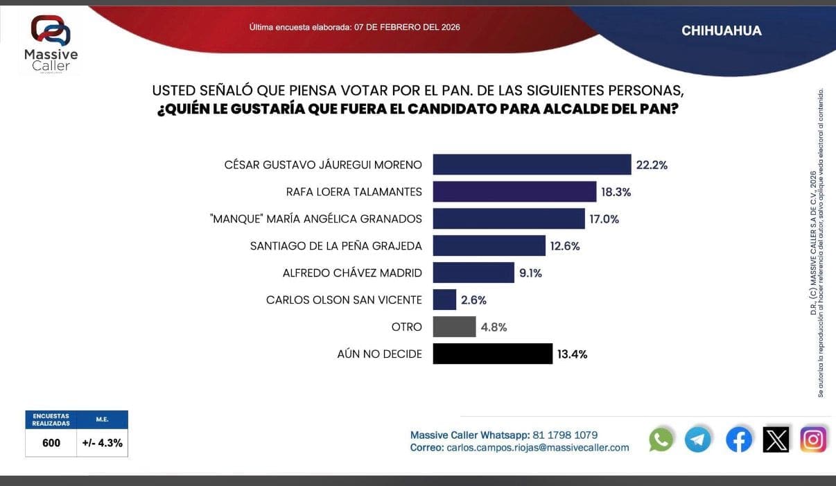 De acuerdo con los más recientes resultados de la casa encuestadora Massive Caller, la contienda interna del PAN en Chihuahua muestra un movimiento claro a favor de César Jáuregui Moreno, quien registra un incremento sostenido en las preferencias ciudadanas.