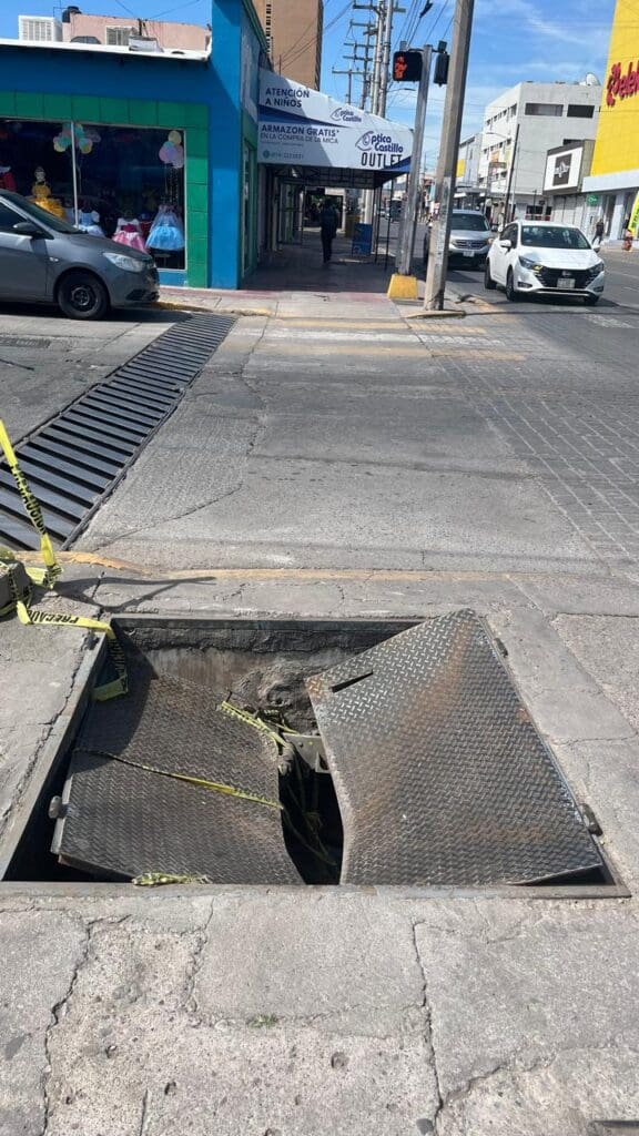 La alcantarilla se encuentra sobre la banqueta de esta importante y trasitata Avenida del centro de la ciudad.