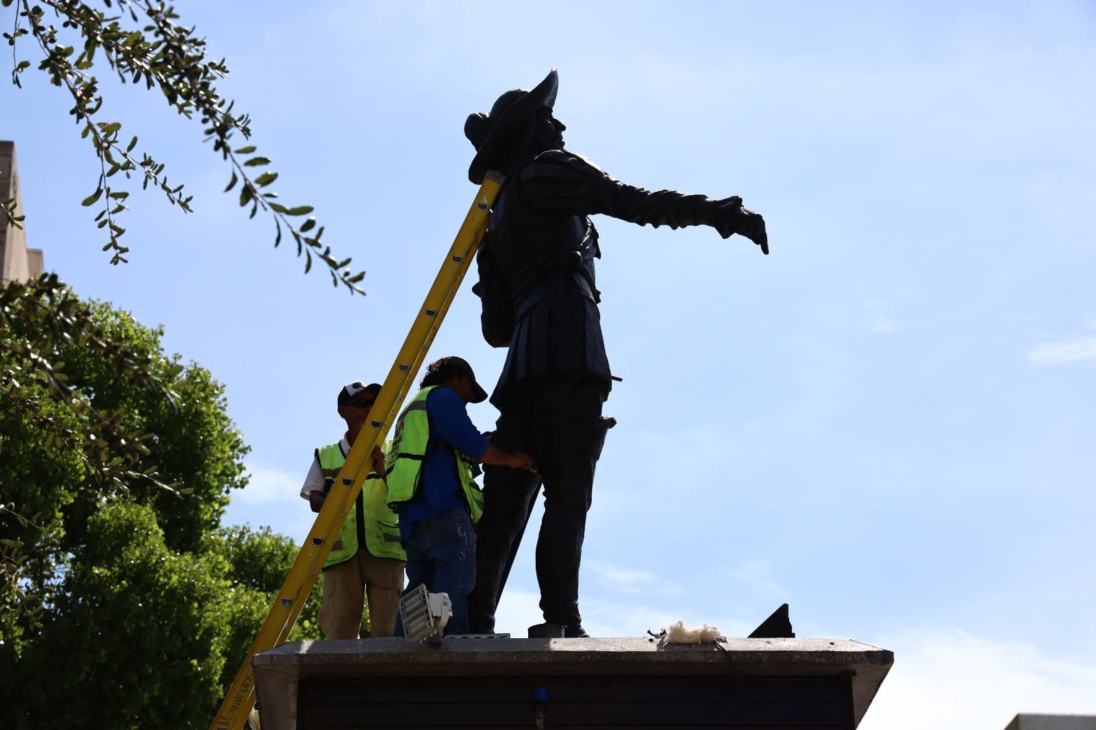 A horas de conmemorar los 316 años de la Fundación de la Ciudad de Chihuahua, la Dirección de Mantenimiento Urbano del Gobierno Municipal, realiza labores de mantenimiento al monumento a Antonio Deza y Ulloa que se ubica en la Plaza de Armas.