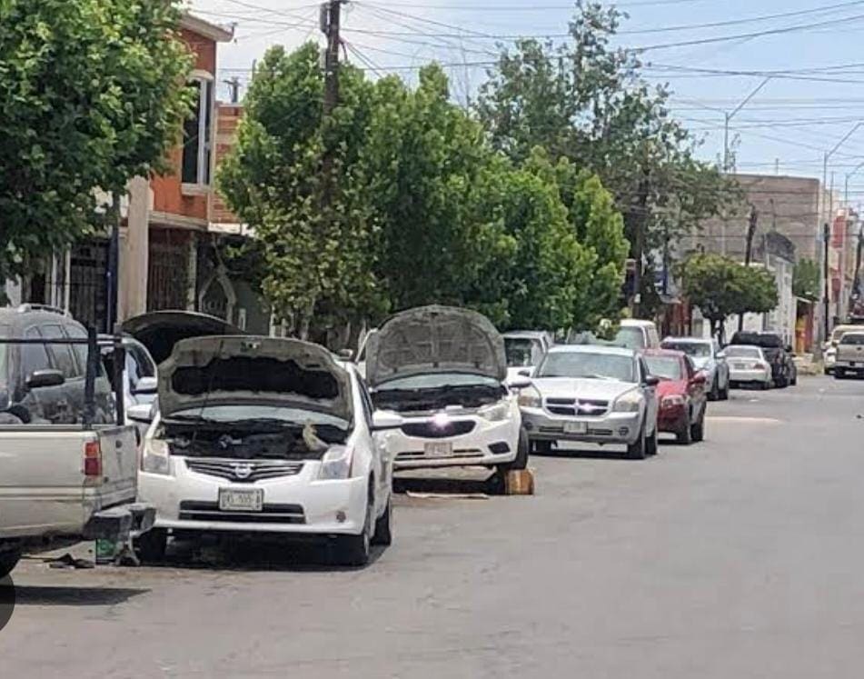Se quejan, de un camión y camionetas que están obstruyendo la calle en calle Namimbia en la colonia Praderas de León por un taller mecánico que afecta la visibilidad de los conductores, e invadiendo banquetas y calle, a los que pasan por el lugar.