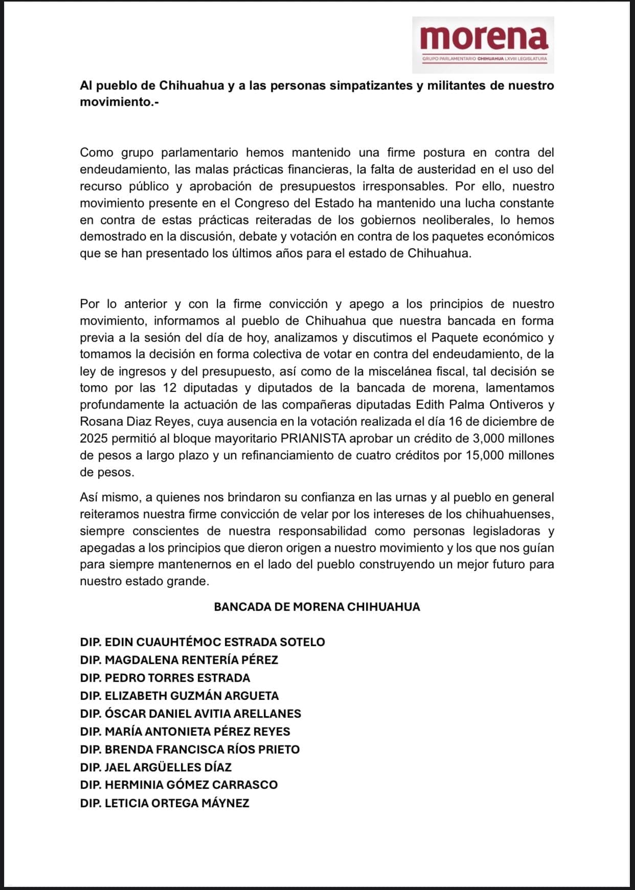 Por medio de redes sociales el coordinador de la bancada de Morena en el Congreso, Cuauhtémoc Estrada y la presidenta del partido en Chihuahua, Briggite Granados, emitieron una postura sobre la «desaparición» de las diputadas Rosana Díaz y Edith Palma, durante la votación de la adquisición de un nuevo crédito para el Gobierno del Estado.