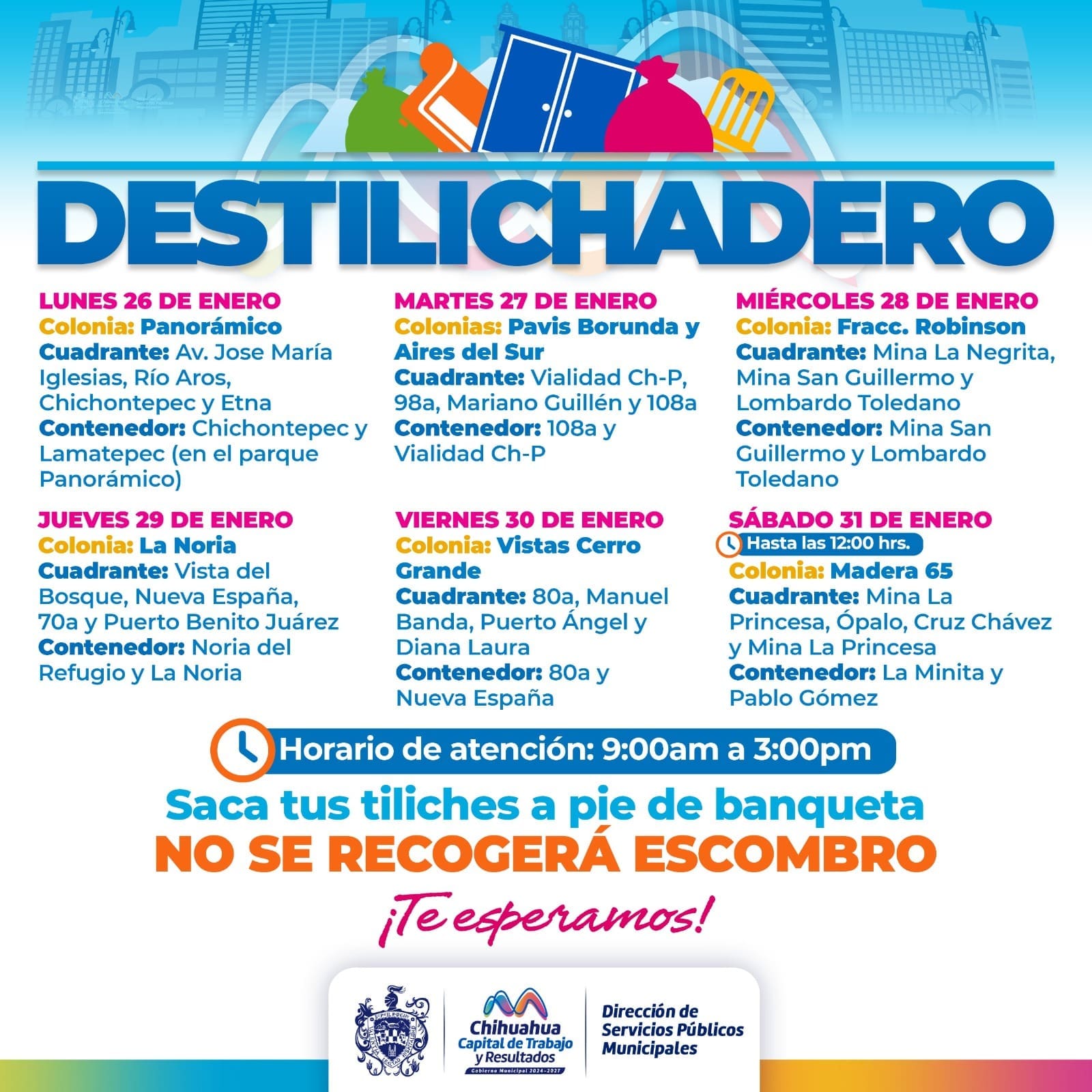 Con el objetivo de prevenir la acumulación de basura de grandes dimensiones en los hogares y reducir riesgos sanitarios, el Gobierno Municipal de Chihuahua, a través de la Dirección de Servicios Públicos Municipales, dio a conocer el calendario del programa Destilichadero, el cual se llevará a cabo del 26 al 31 de enero en siete colonias de la capital.