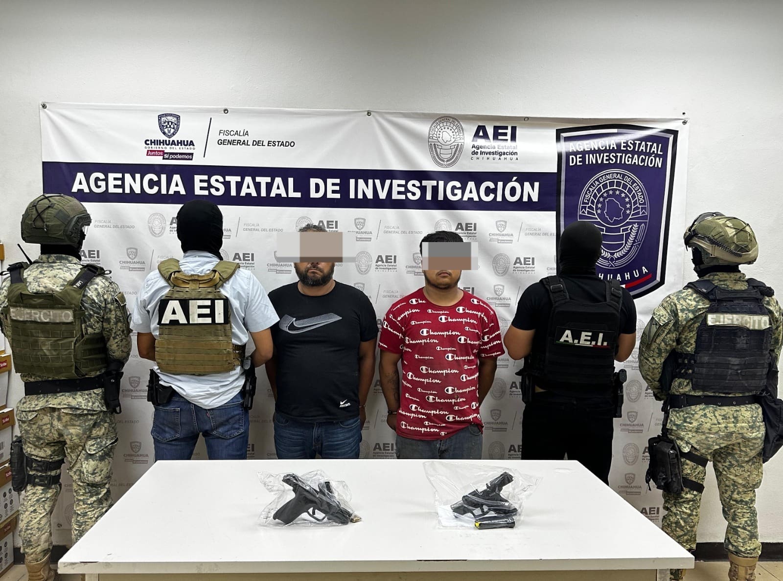 La detención se registró en la calle 4ta y Privada de Francisco Portillo de la colonia División del Norte en Ciudad Juárez.A las mencionadas personas les aseguraron dos armas de fuego tipo pistola calibre 9 milímetros con sus respectivos cargadores, abastecidos con 06 y 08 cartuchos útiles.