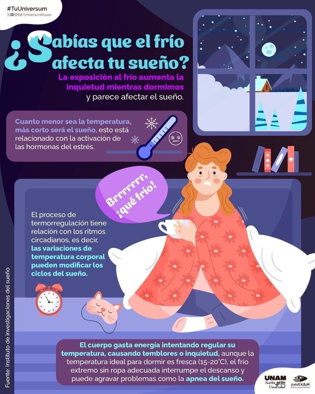 La exposición a bajas temperaturas durante la noche puede provocar mayor inquietud, interrupciones en el descanso y un sueño más corto, debido a la activación de las hormonas del estrés y al esfuerzo que realiza el cuerpo para mantener su temperatura, de acuerdo con información del Instituto de Investigaciones del Sueño.