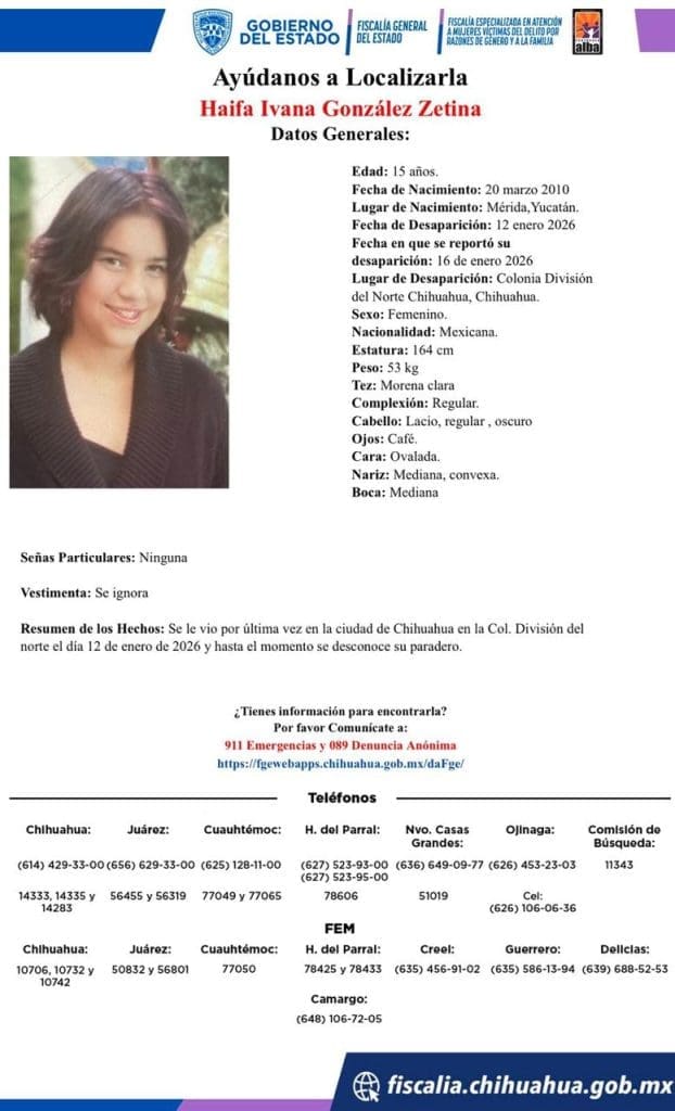Se trata de Ofelia González Cetina de 14 años de edad, unos 60 metros de estatura, tés morena clara y 47 kilos. Su hermana es Ivana González Cetina de 15 años de edad, unos 64 de estatura, tés morena clara y 53 kilos de peso.
