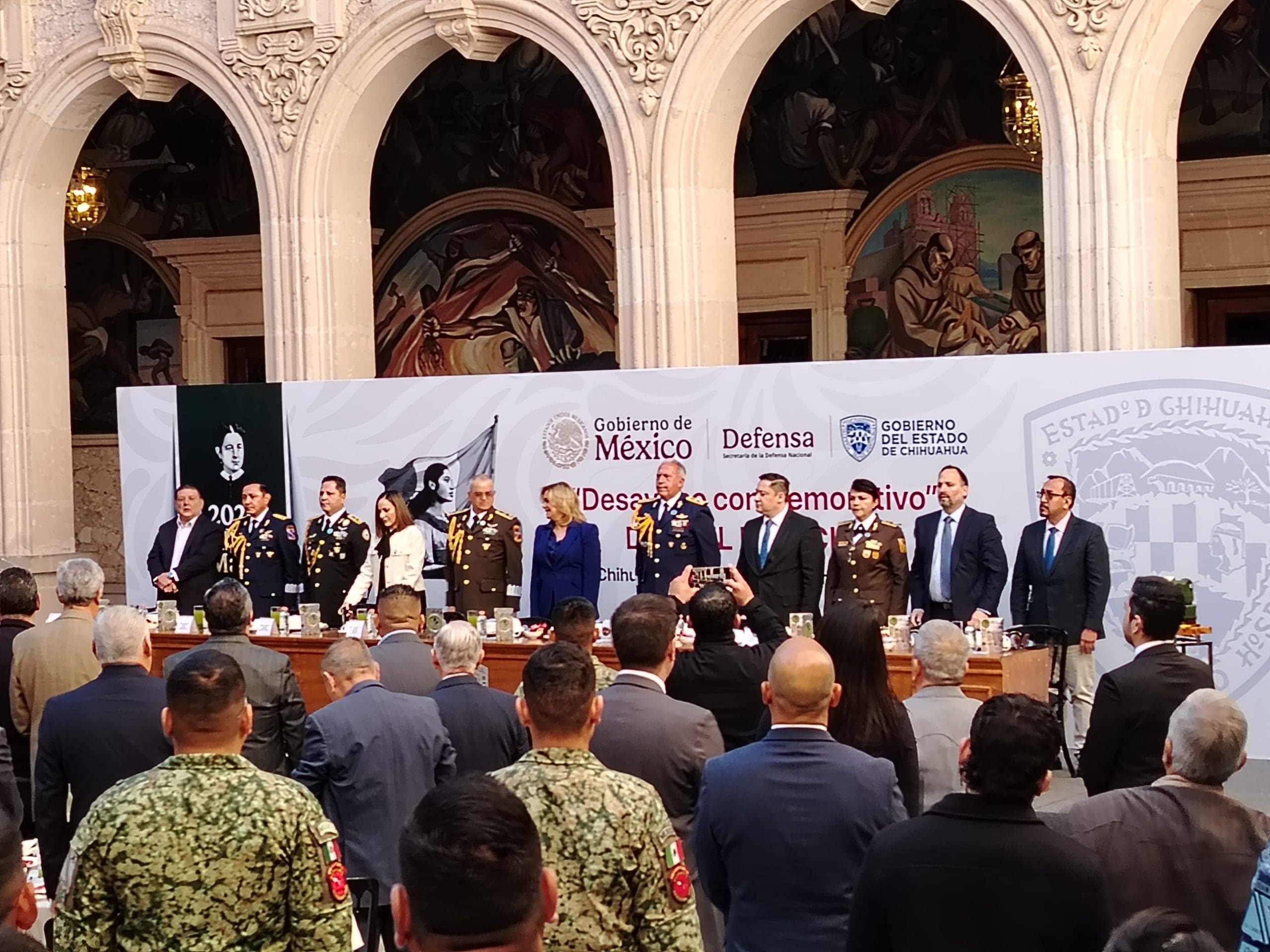 La gobernadora Maru Campos encabezó este jueves en Palacio de Gobierno el evento conmemorativo del 113 aniversario del Ejército Mexicano, acompañada de la presidenta del Supremo Tribunal de Justicia del Estado, Marcela Sandoval, y el fiscal general, César Jáuregui.
