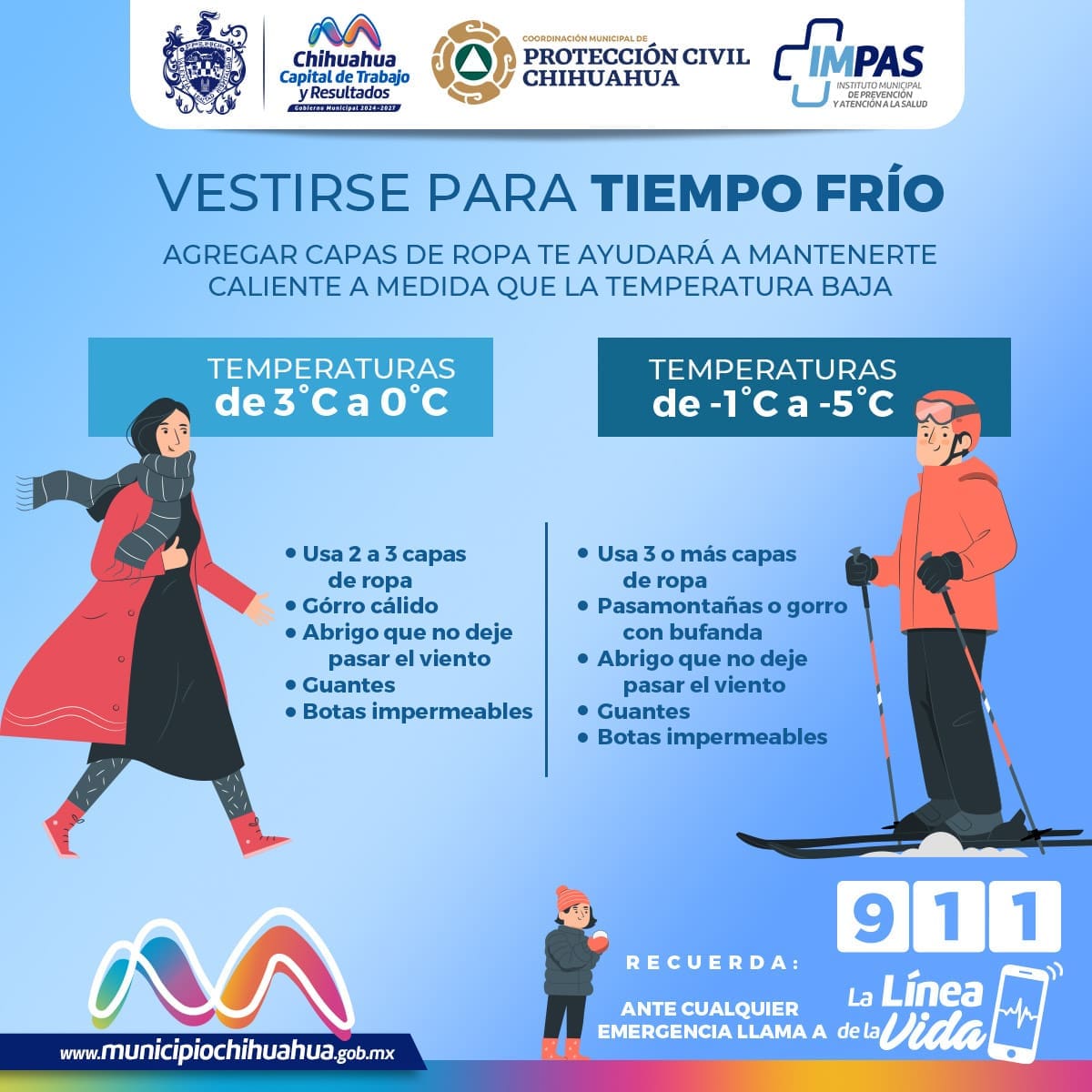 Ante el descenso de temperaturas registrado en la capital, se recomendó utilizar ropa por capas para conservar el calor corporal y adaptarse a las variaciones térmicas del día. Para temperaturas de entre 3 y 0 grados centígrados, se sugiere el uso de dos a tres capas de ropa, gorro, abrigo, guantes y calzado impermeable, mientras que en condiciones más extremas, de -1 a -5 grados, se aconseja emplear tres o más capas, ropa térmica y protección adicional para cabeza y rostro.