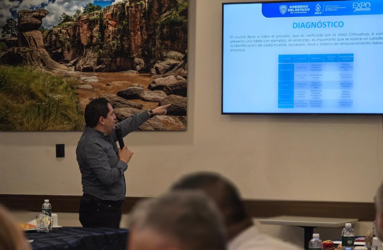 Durante el encuentro, el director ejecutivo de la JMAS Chihuahua, Alan Falomir, subrayó la importancia de mantener una comunicación constante con cámaras y asociaciones, a fin de atender de manera conjunta las necesidades en materia de agua potable y saneamiento.
