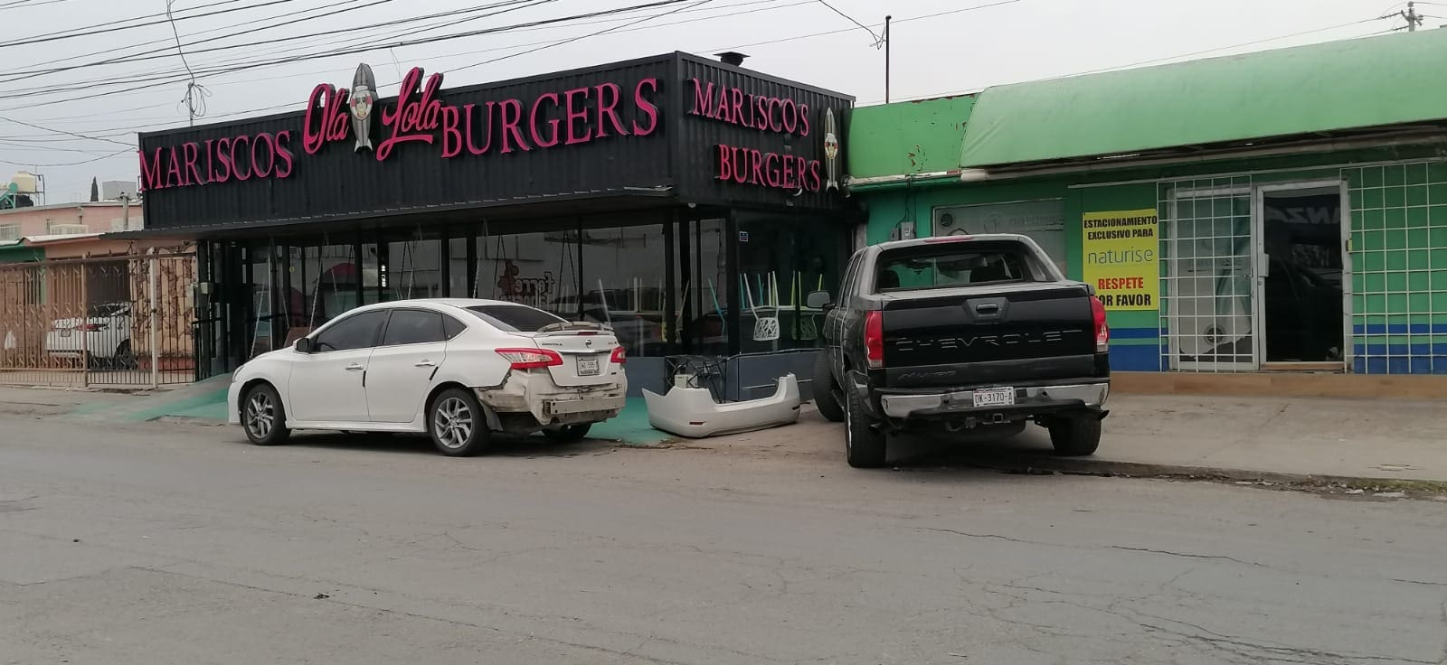 De acuerdo con el reporte en el lugar, el Sentra presentó daños considerables, principalmente en la parte trasera, quedando detenido justo afuera de un restaurante de venta de mariscos.