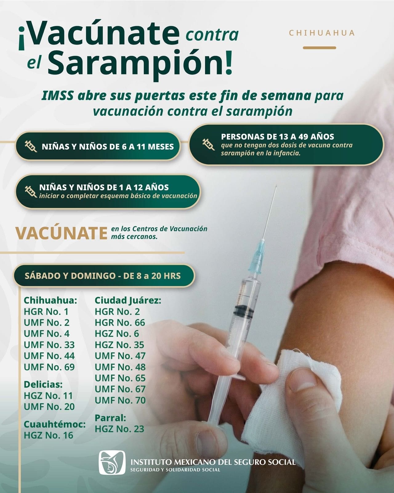 El Instituto Mexicano del Seguro Social (IMSS) anunció una jornada intensiva de vacunación contra el sarampión que se llevará a cabo este fin de semana en distintos centros médicos del estado de Chihuahua.