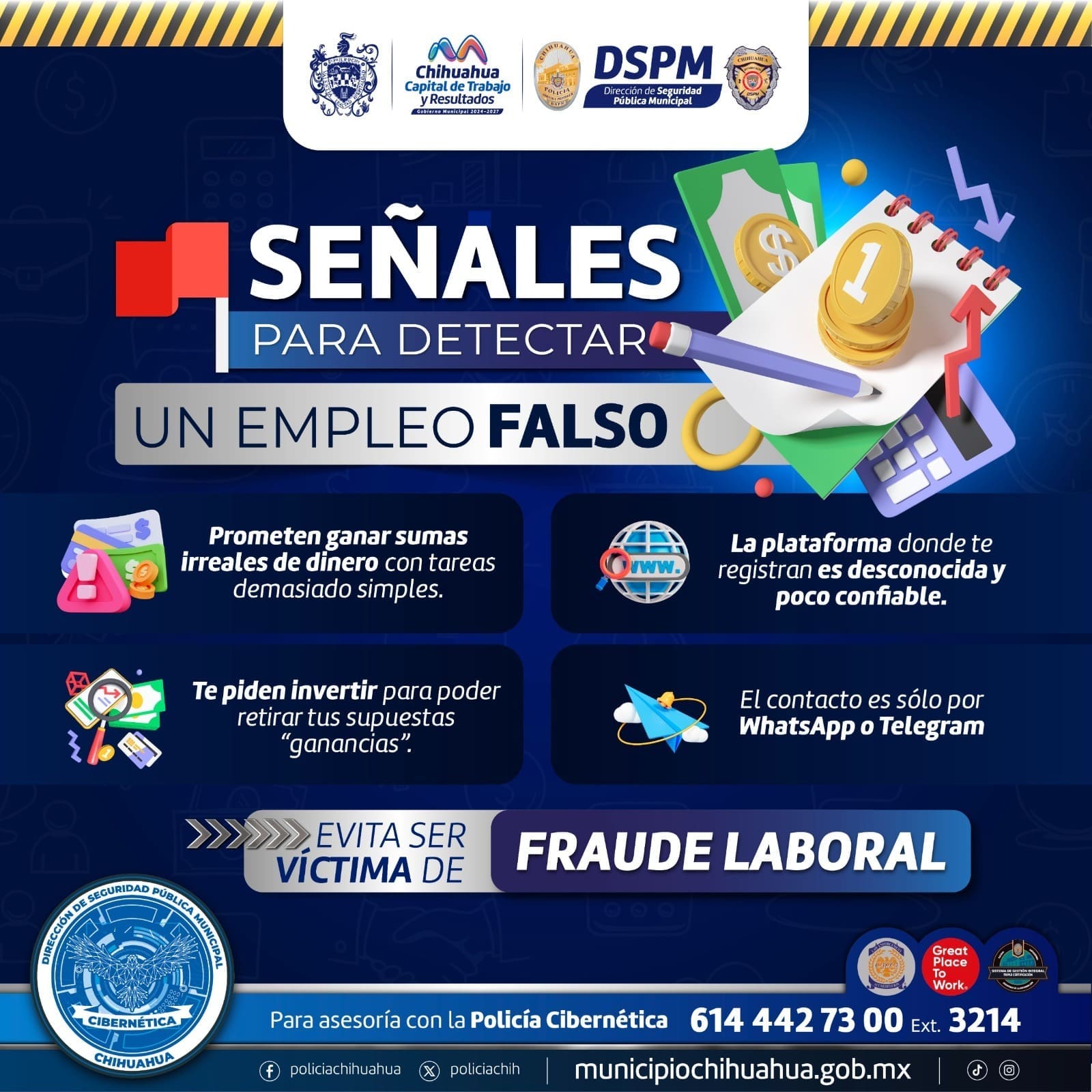 La Dirección de Seguridad Pública Municipal a través de la Policía Cibernética alerta sobre las principales señales para identificar propuestas de empleo falsas y prevenir ser víctima de fraude, números del extranjero, se les invita a ser parte de algunos empleos principalmente a través de redes sociales.