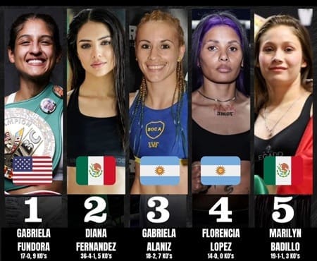 Detrás de la campeona unificada, se encuentra la estadounidense Gabriela Fundora, la excampeona mundial argentina, Gabriela Alaniz; la invicta pampera, Florencia López, así como la mundialista mexicana Marilyn Badillo.
