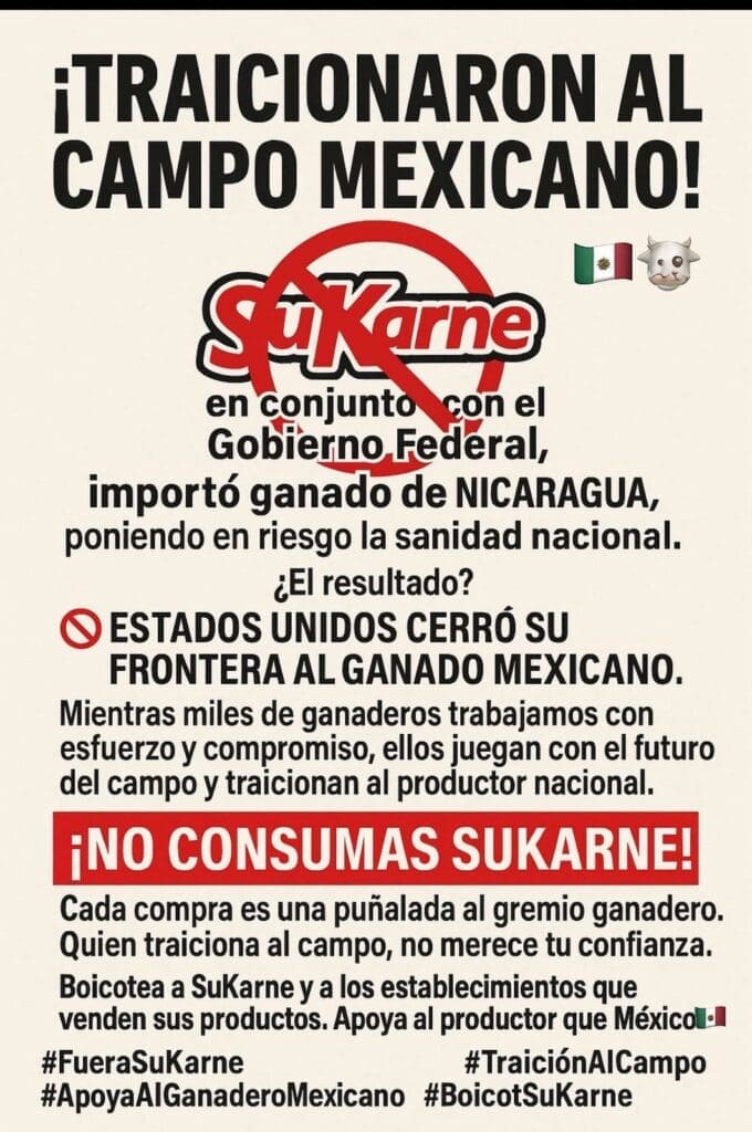Consumir SuKarne es una puñalada para el sector ganadero nacional, y quien traiciona al campo mexicano no merece tu confianza, finaliza la publicación.