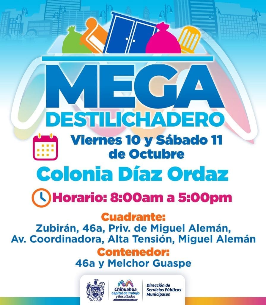 La Dirección de Servicios Públicos del Municipio llevará este viernes 10 y sábado 11 de octubre a la colonia Díaz Ordaz el «Mega Destilichadero» con el cual buscan que la ciudadanía evite el acumulamiento de tiliches en la vía pública y en las viviendas.