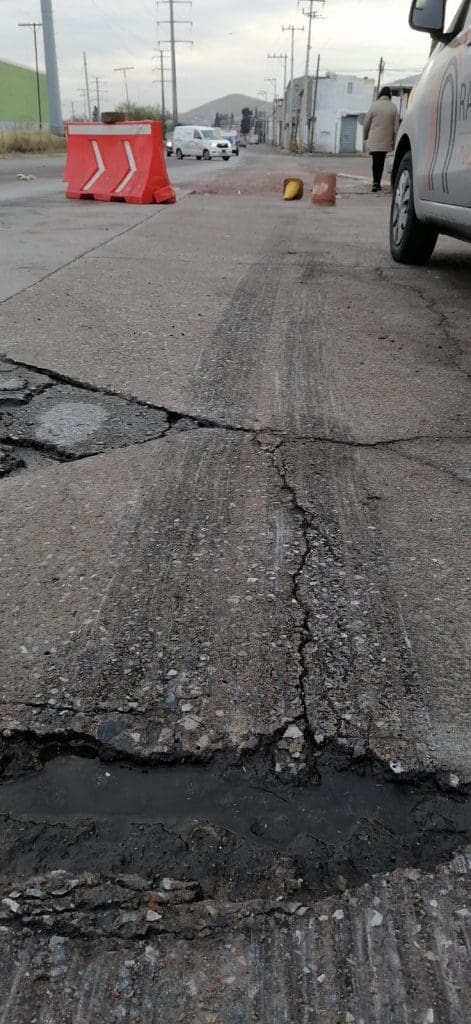 La zona afectada se localiza sobre la vialidad ChP a unos metros de llegar a la calle Pedro Meoqui, donde conductores circulan a velocidad constante, por lo que el riesgo de accidentes es alto.