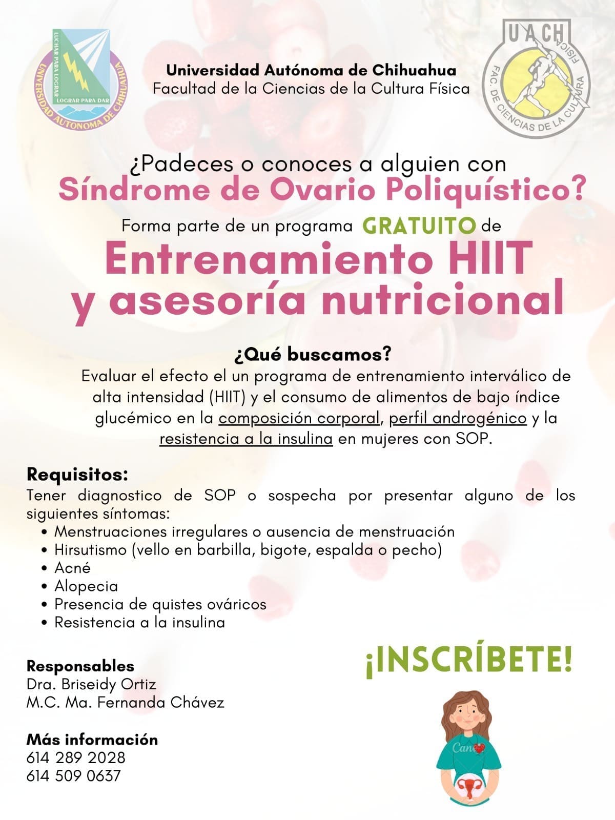Las personas interesadas en participar pueden solicitar mayores informes a los teléfonos 614-289 2028 y 614-509 0637, y formar parte de esta iniciativa impulsada por la UACH, que reafirma su compromiso con la investigación aplicada, la promoción de la salud y el impacto social desde el ámbito universitario.