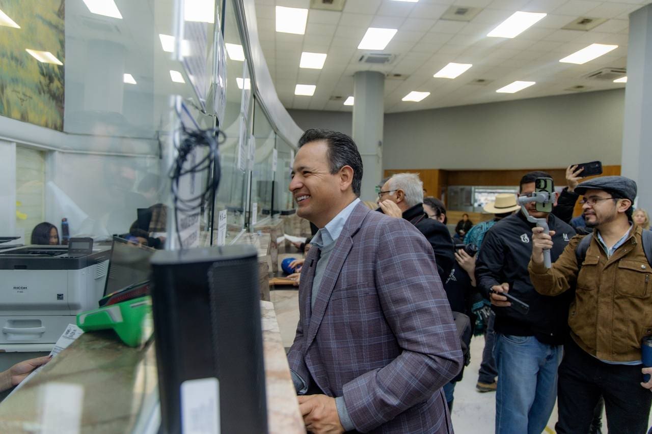 El presidente municipal de Chihuahua, Marco Bonilla, acudió esta mañana a las Cajas de la Tesorería del Edificio Eloy S. Vallina, para hacer el pago del impuesto predial correspondiente a sus propiedades.