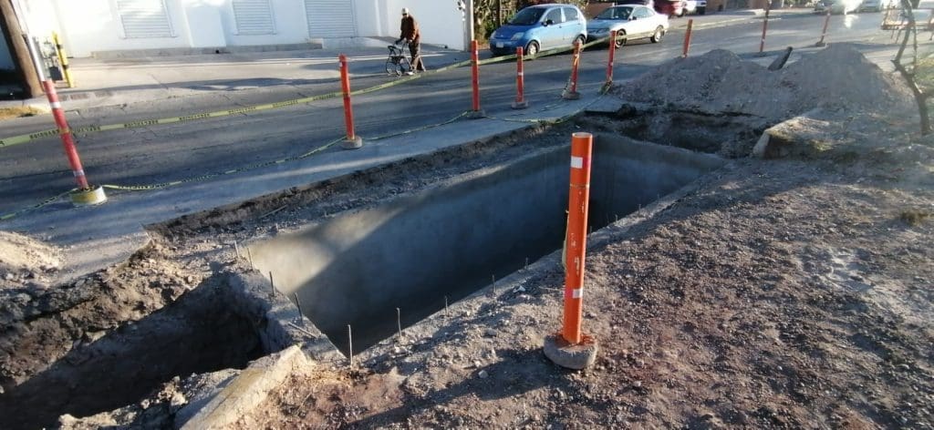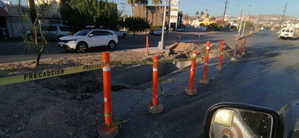 Esta mañana se presentan trabajos importantes de la Junta Municipal de Agua y Saneamiento (JMAS) sobre la avenida Francisco Villa, justo en el cruce con la calle Guatemala, en dirección hacia avenida Las Águilas.