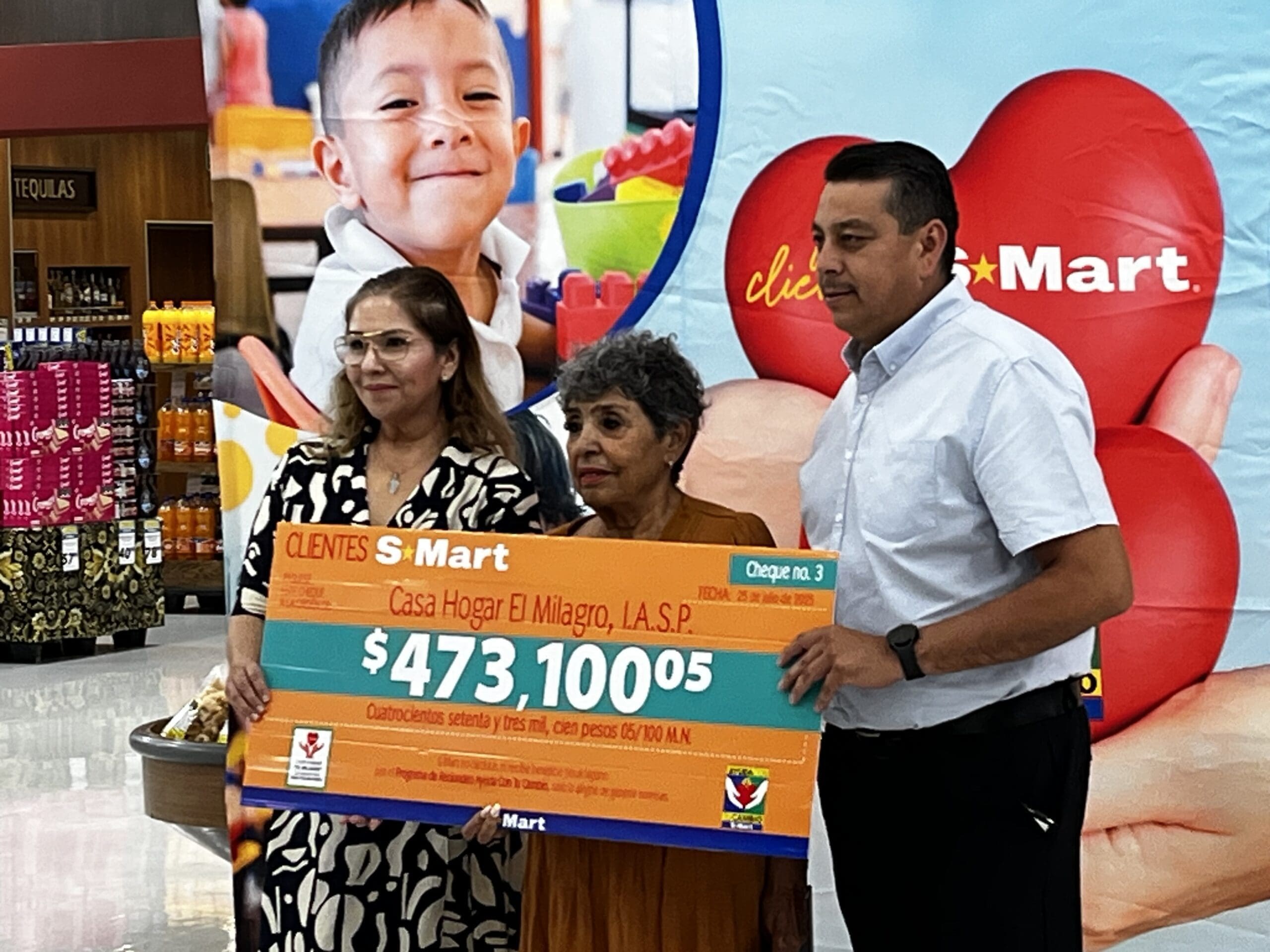 Supermercados S-Mart entregó 473 mil 100 pesos a la Casa Hogar El Milagro como resultado de su tercera campaña de redondeo «Ayuda Con Tu Cambio», donde el 87% de los clientes donaron sus centavos durante mayo y junio.