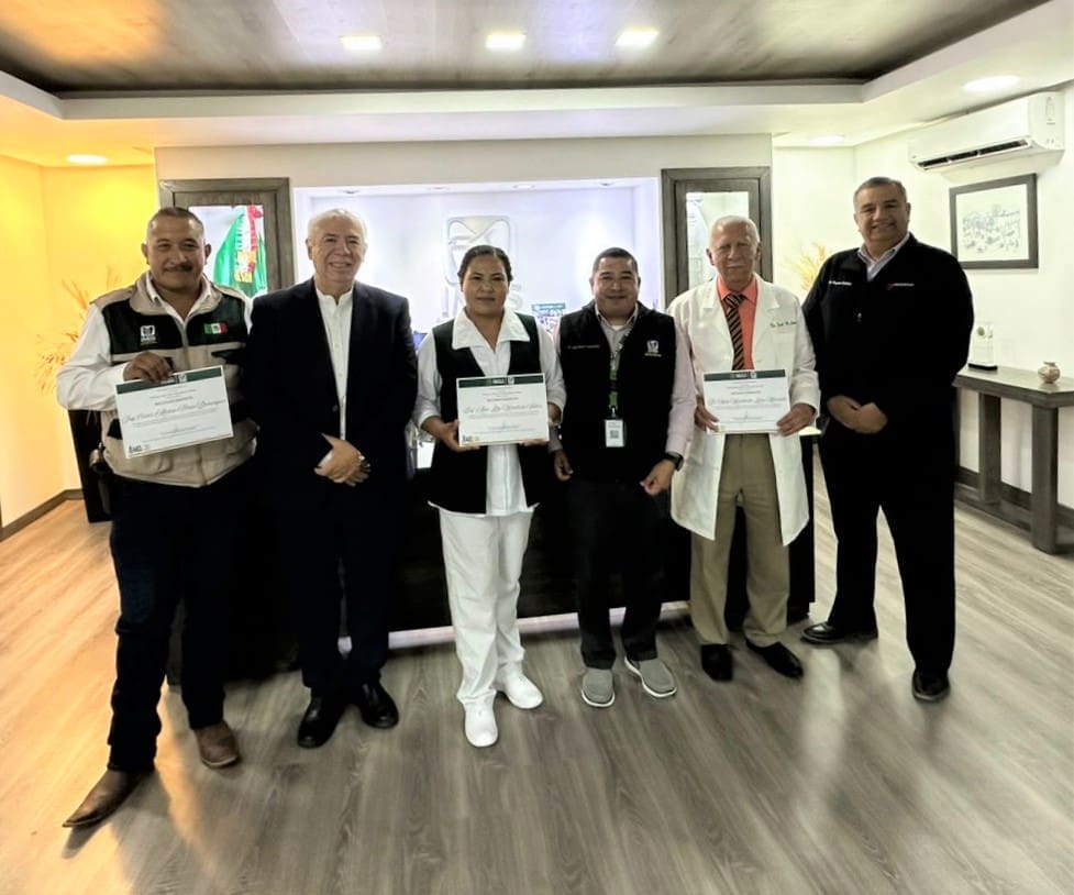 José Antonio Zamudio González, delegado del Seguro Social, encabezó la entrega de estos distintivos, los cuales fueron entregados a los doctores Saúl Humberto Lara Mercado y Sergio Adrián Mendoza Sánchez; de la enfermera Ana Lilia Monclova Valois y del ingeniero César Alonso Pérez Domínguez.
