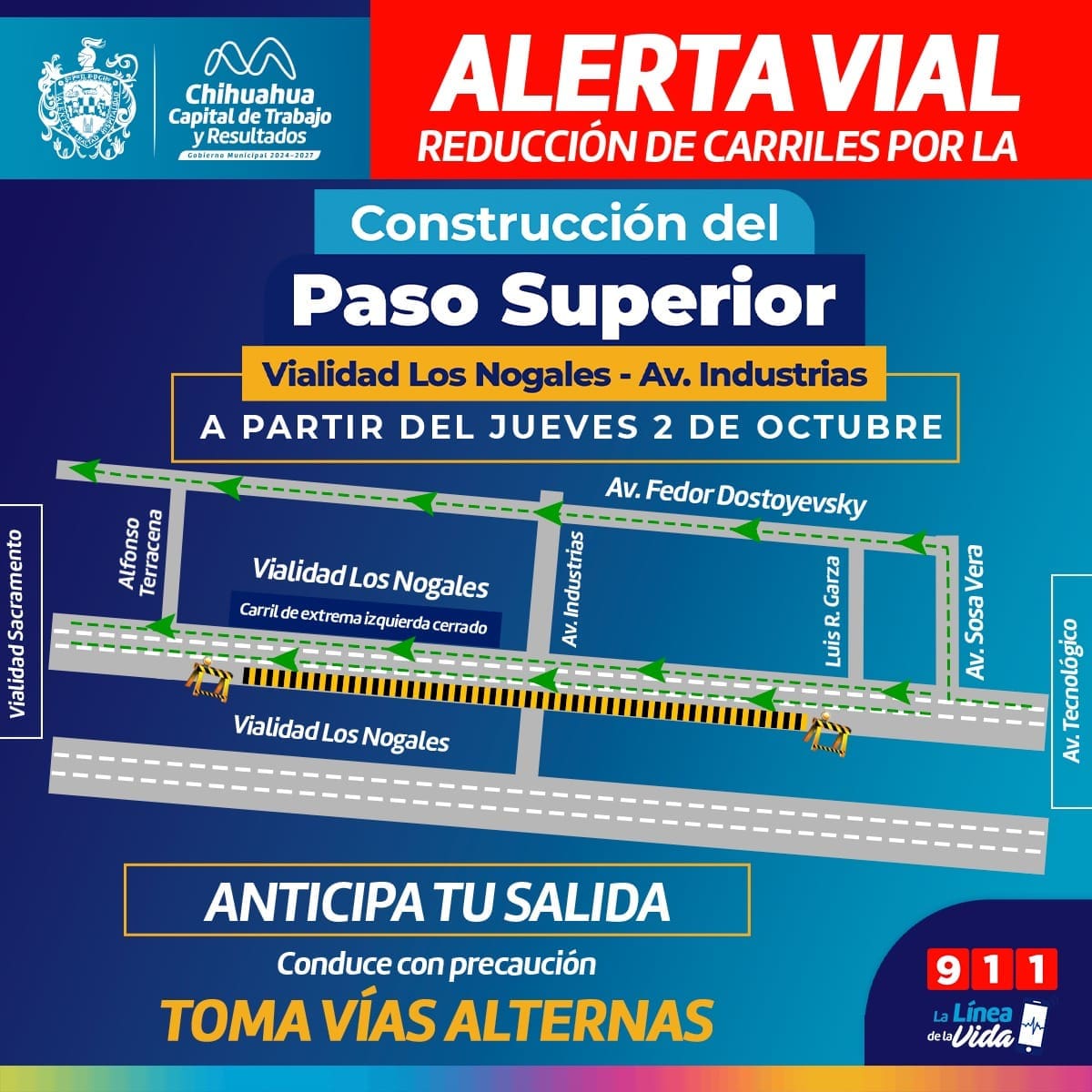 Como alternativa, quienes transiten en sentido poniente-oriente podrán utilizar la avenida Sosa Vera para incorporarse a la avenida Dostoyevski.