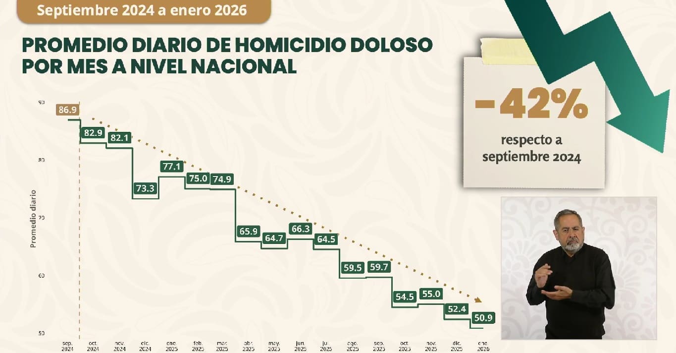 El informe señala que enero de 2026 es el mes de enero con menos homicidios en los últimos 10 años, marcando un punto de inflexión en las estadísticas de violencia del país. En general, los delitos de alto impacto se redujeron 31% a nivel nacional durante el periodo evaluado.