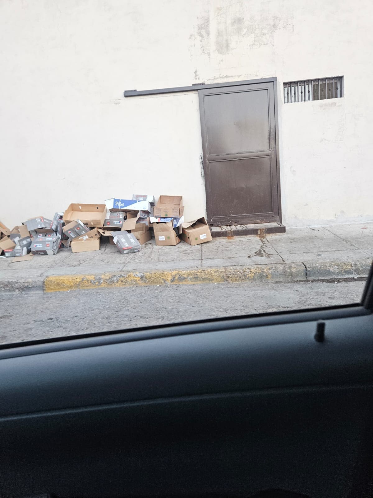 Así es la situación que pasa con algunos establecimientos que pagamos por el servicio de recolección de basura, ni aun estando al corriente con el pago los recolectores del municipio se la llevan los días que toca en esta zona en contraste con otros establecimientos que deberían de pagar por un contenedor ya que generan demasiada basura los mismos trabajadores de la recolección la sacan incluso de adentro del establecimiento como son tambos de desechos organismos y una cantidad considerable de cajas de cartón en otras cosas. No es parejo para todos el servicio aunque se supone que traen un supervisor los camiones