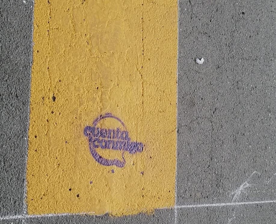 La imagen, captada a nivel de piso, muestra el emblema en color morado sobre el pavimento, lo que generó curiosidad entre quienes transitan por la zona, al tratarse de un sello institucional en un espacio destinado a la seguridad vial.
