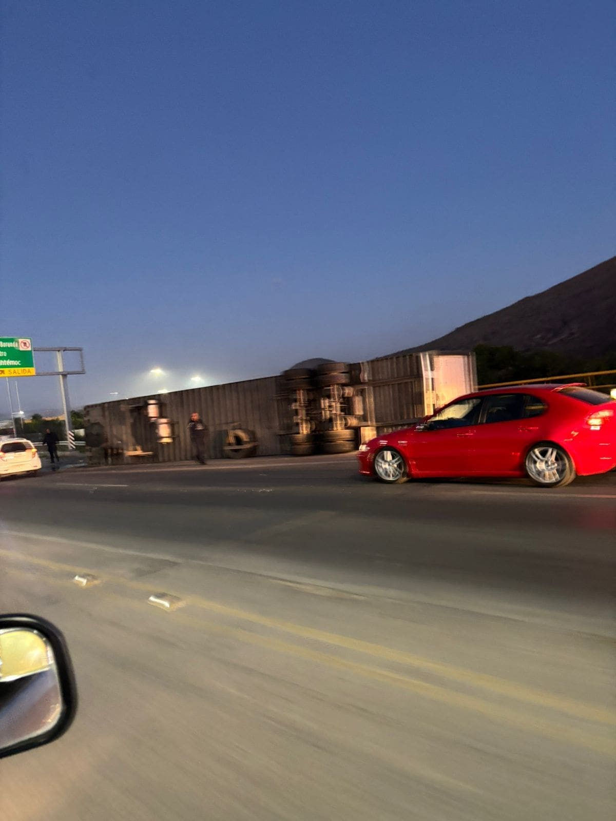 El incidente ocurrió en el tramo cercano a la Vialidad Sacramento, donde la unidad cargado de carne quedó atravesada en el carril derecho de la carretera, obligando al cierre parcial de la circulación mientras personal de emergencias y grúas trabajaban en el retiro del vehículo.