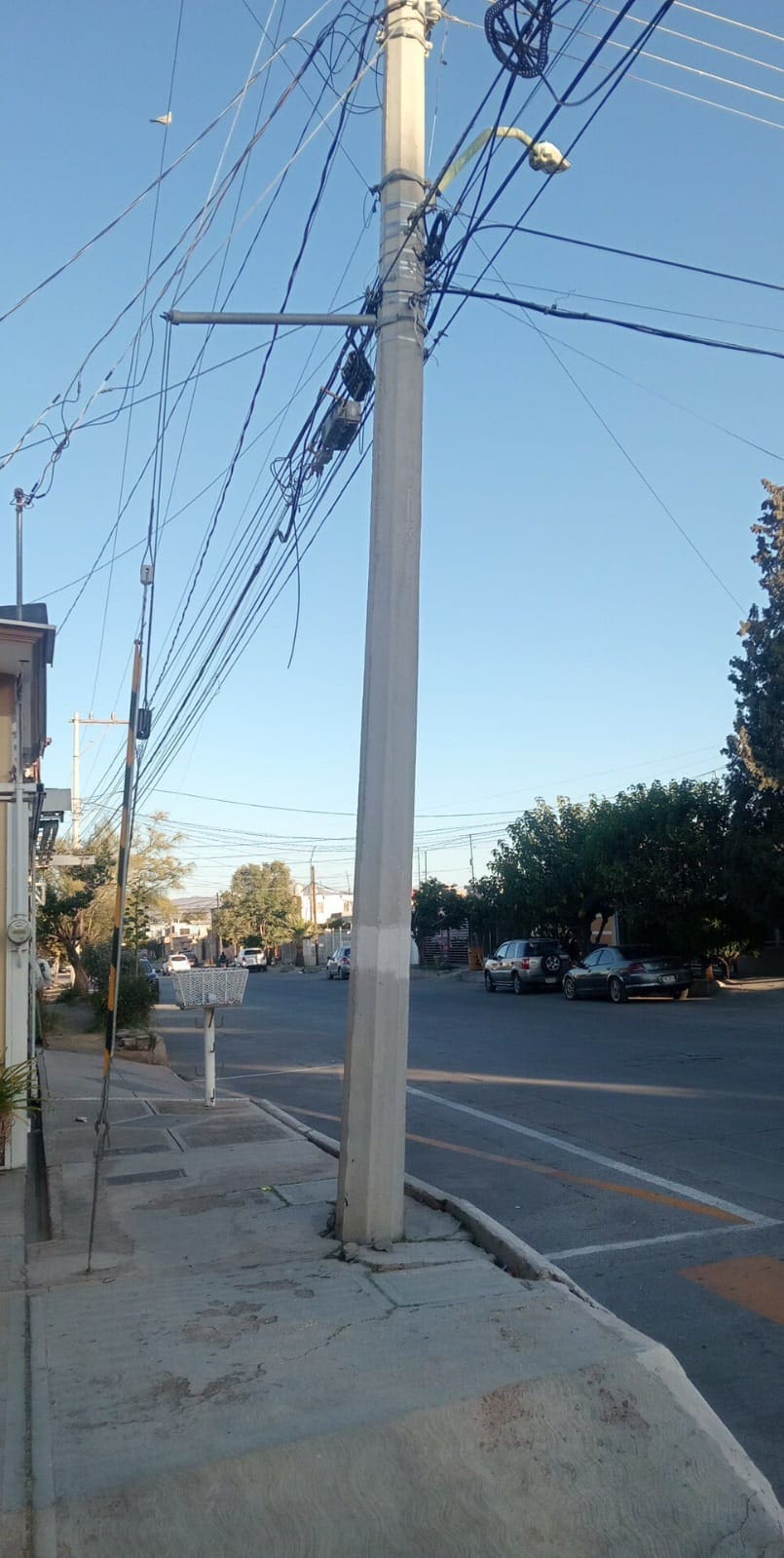 Vecinos de la colonia Villa Juárez reportaron la presencia de un poste inclinado y en aparente riesgo de caer, ubicado en la calle Francisco Villa y Décima, número 2908, justo frente a la Guardería de Dianita.