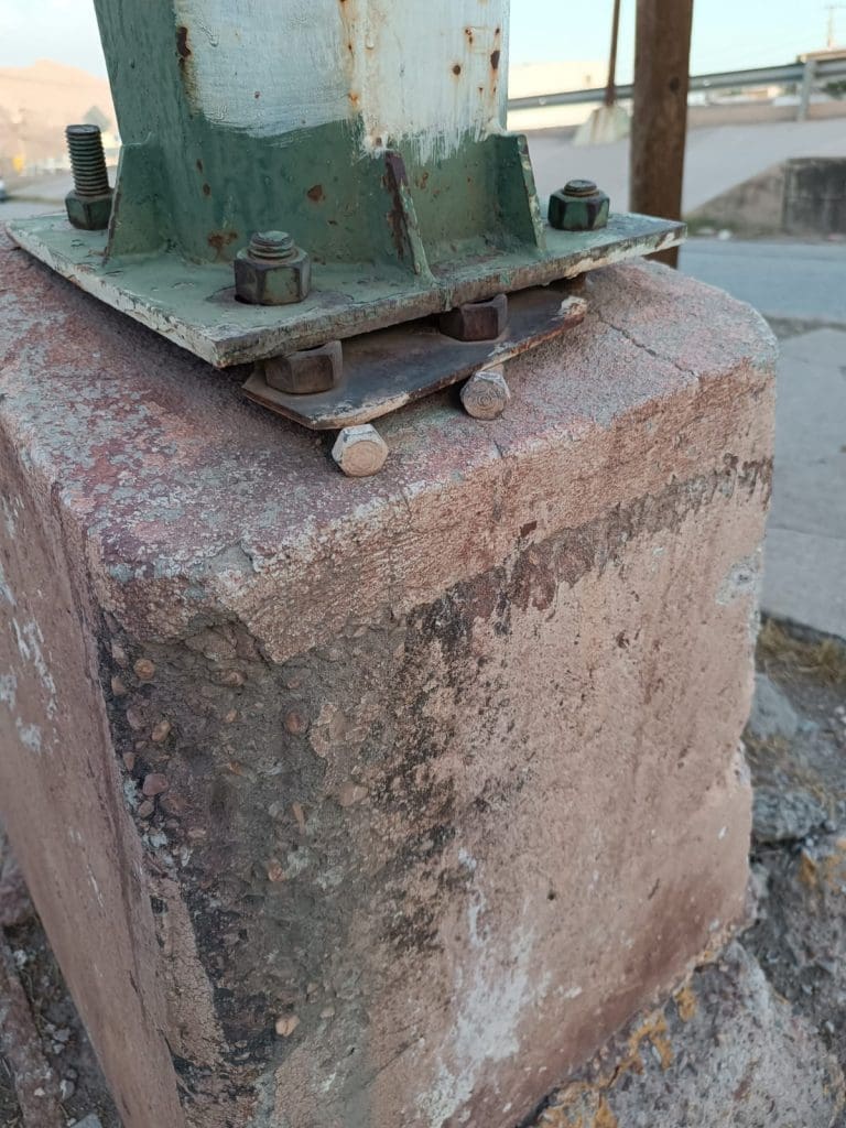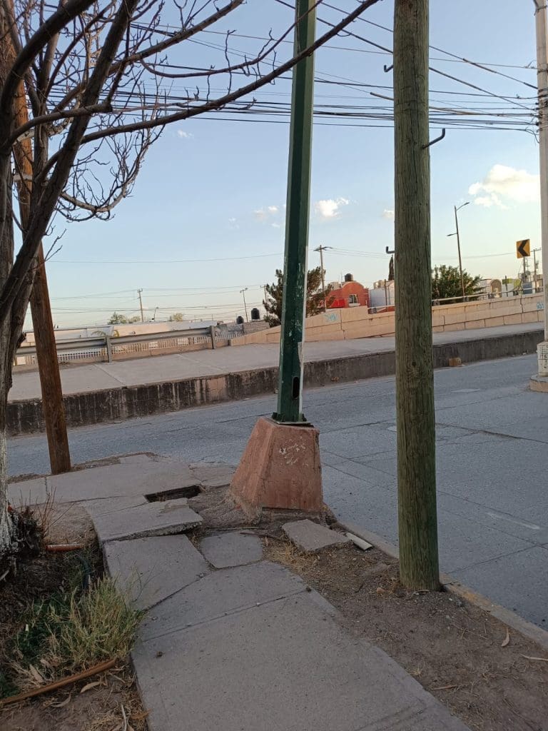 Según las fotografías compartidas, el poste presenta una inclinación visible y su base se encuentra fracturada y desplazada, lo que aumenta el riesgo de que caiga sobre las viviendas cercanas o sobre algún peatón.