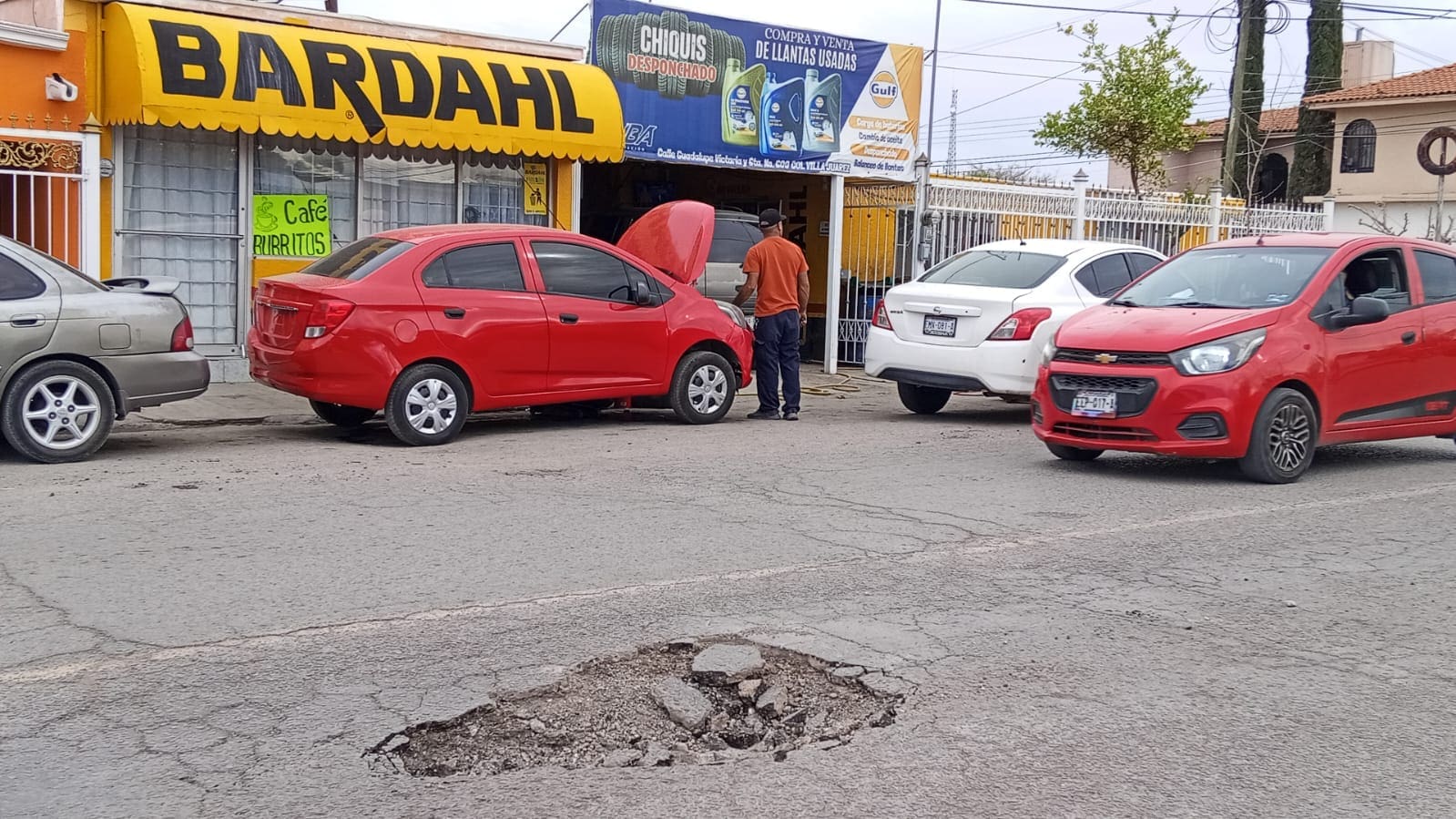 Ciudadanos denunciaron la presencia de un bache en la calle Guadalupe Victoria, casi esquina con la calle 6ª, en la colonia Villa Juárez, lo que representa un riesgo para automovilistas que circulan por la zona.